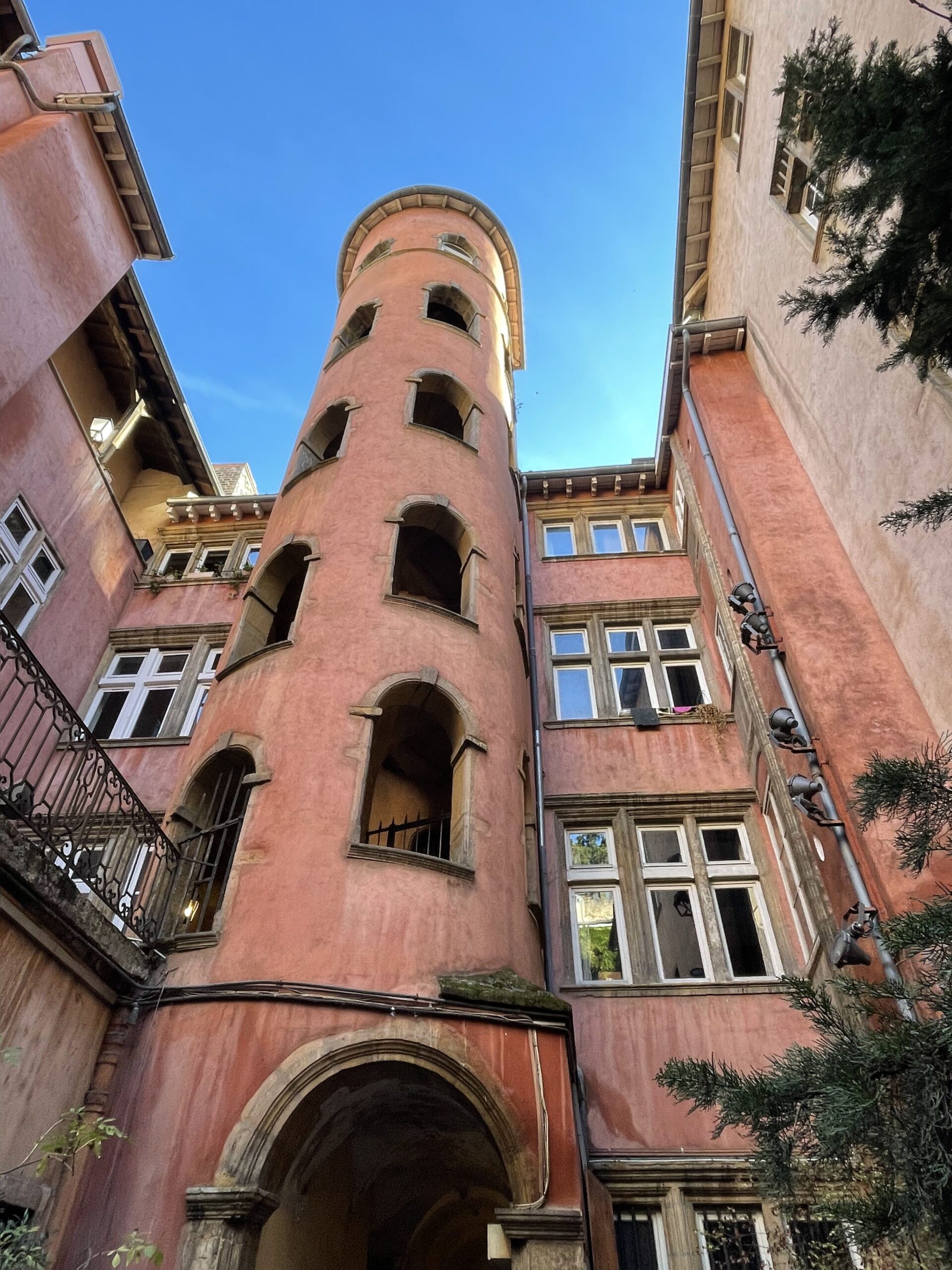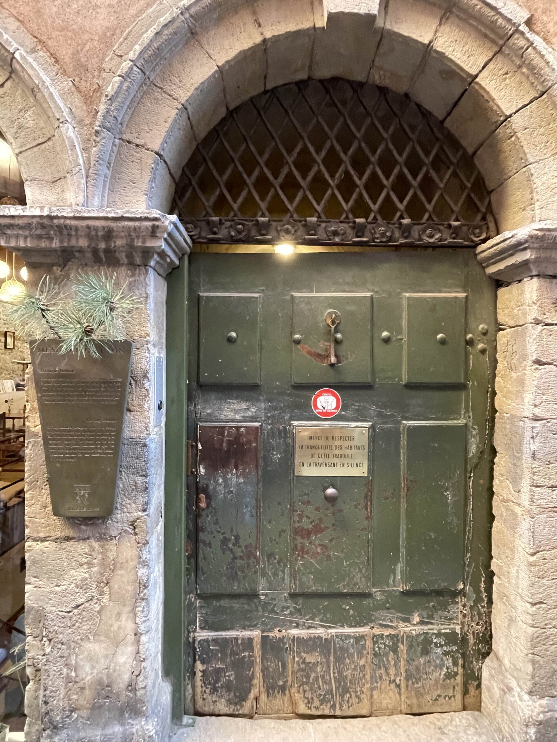 Son unos callejones o pasajes escondidos a través de edificios que se utilizaban para transportar las telas sin tener que salir a la calle y así evitar que con el mal tiempo se arruinaran los productos. Hay unos 300 o 400 traboules por Lyon pero solo 25 están “en convención” como se les dice.