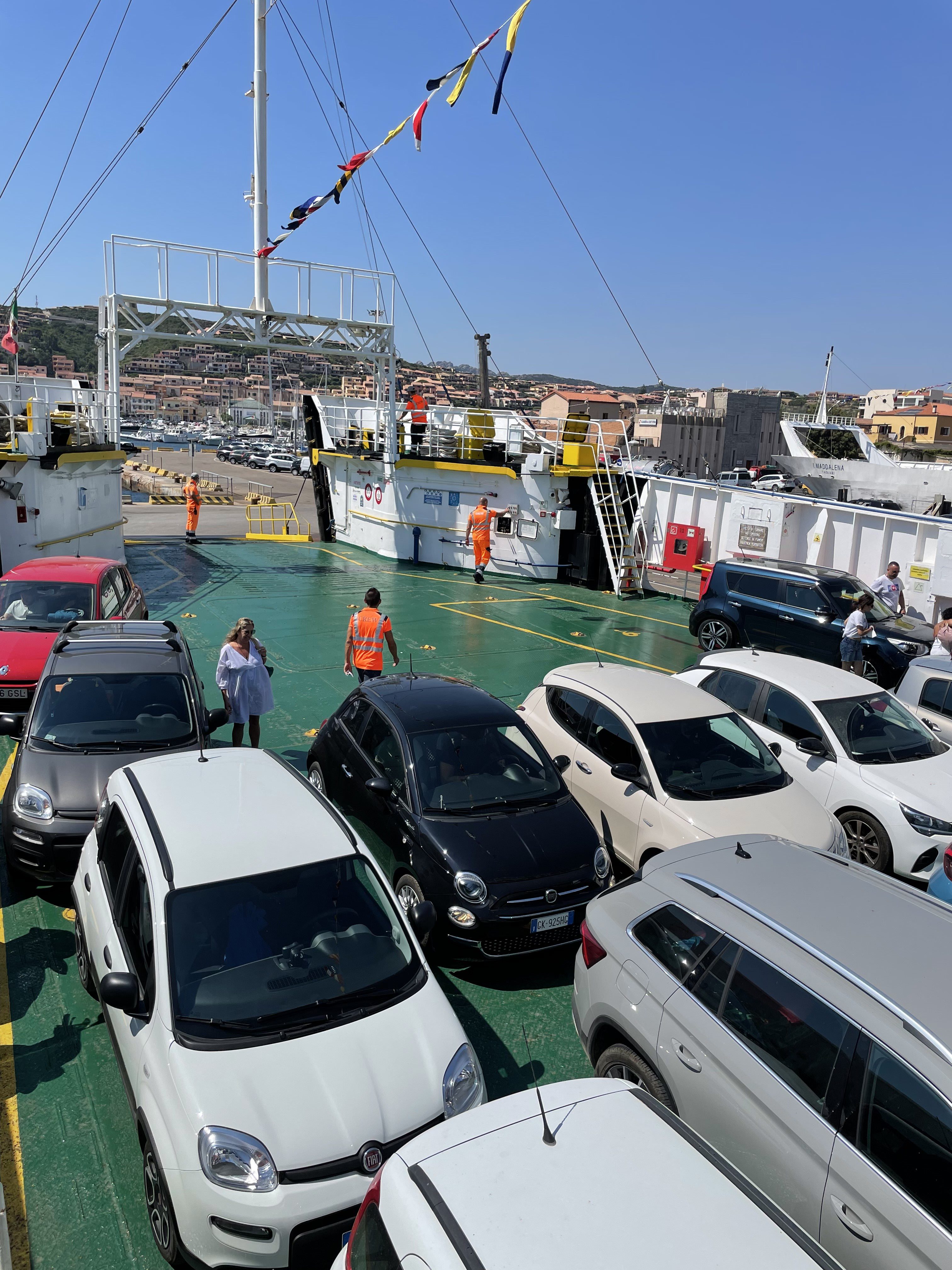 Los ferrys de “Maddalena Lines” salen desde el Puerto de Palau, una ciudad frente a la Isla, cada media hora. El trayecto es corto de unos 20 min. Se puede cruzar con el auto/coche. Una vez que cruzamos la recorrimos durante todo el día.