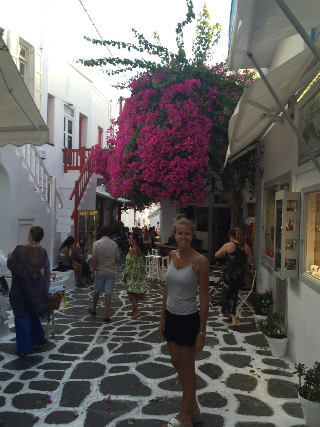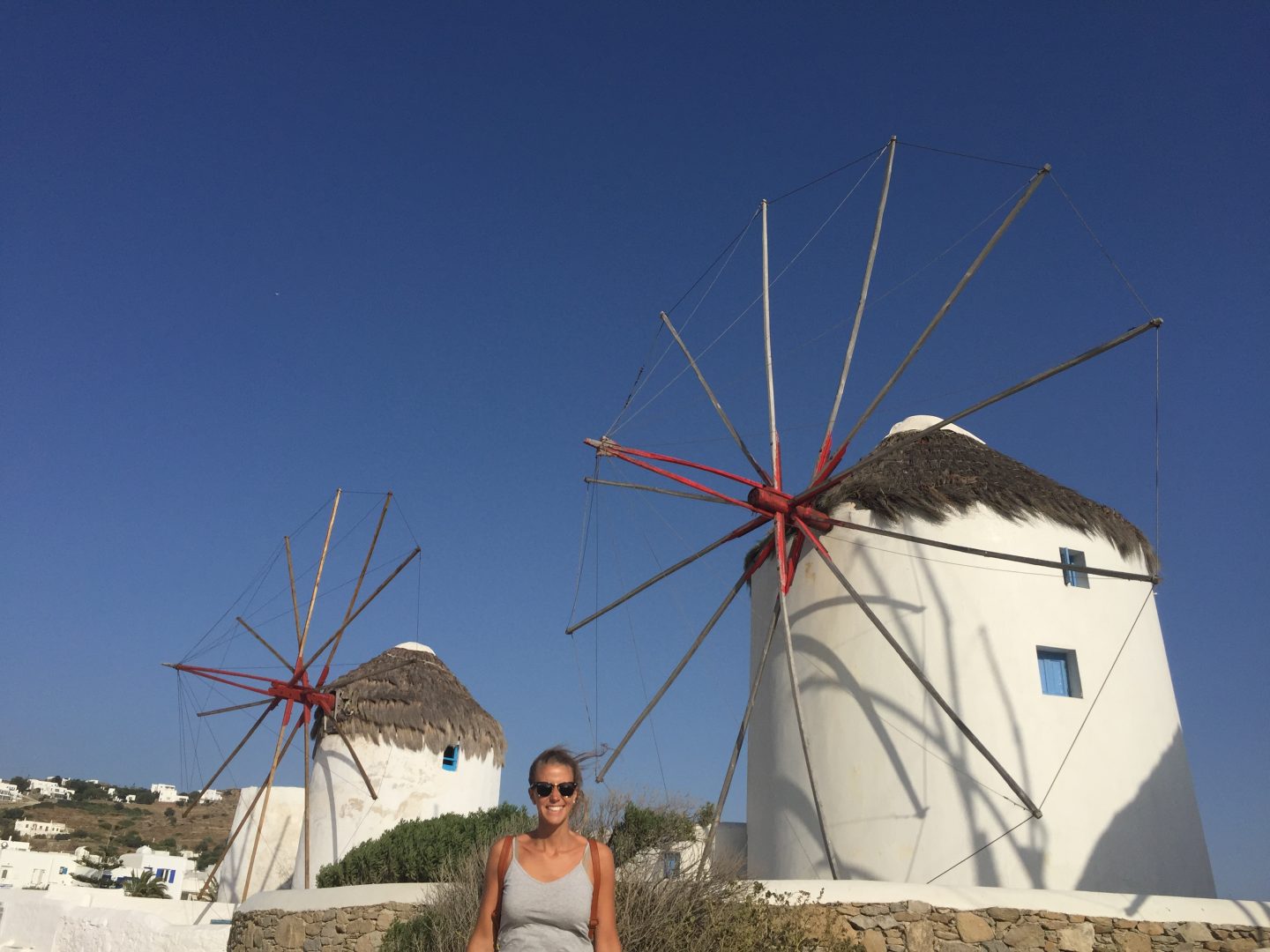 Al centro de Mykonos lo llaman Mykonos town, quedaba a unos 15 min de Agios Ioannis. En el centro tienes los famosos molinos de viento que aparecen en todas las postales. El centro es un encanto. Un típico centro griego todo blanco, chiquito, las puertas celestes, las calles con piedras y los techos redondos. Es re lindo y muy fácil perderse por esas callecitas. Un día me acuerdo con mi marido estuvimos literal media hora para encontrar un restaurant que nos habían recomendado que se llama “Sakis Souvlaki”, los souvlakis de ahí son una fiesta.